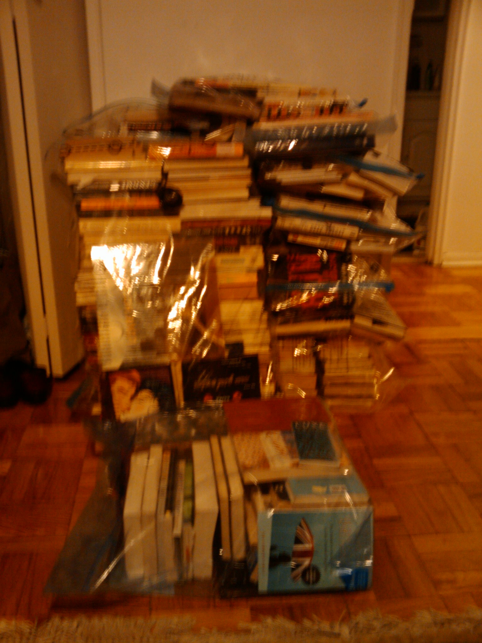- Space Bags and huge Ziploc bags are your friend. Years ago my mother became obsessed with Space Bags, the giant plastic bags you can seal and suck the air out of with a vacuum. She was so into them, I’m sure she would have done a commercial for them, and she sent me an assortment for Christmas years ago that got lost in the same closet as the cabinet doors and random tools. After this experience, I’m a total convert and would probably do a commercial for them myself. I also discovered that Ziploc makes huge versions of their zipper storage bags and bought several boxes of them. They are not only great for dealing with bed bugs, but I don’t have to worry about all of my books, out of season clothes, photos, etc being damaged while I’m away. They are totally awesome for packing, moving, and traveling. Along with the storage bags, I’m grateful that H randomly bought a dolly cart a few months ago, as once I loaded the bags with books, I was able to actually move them into another room.